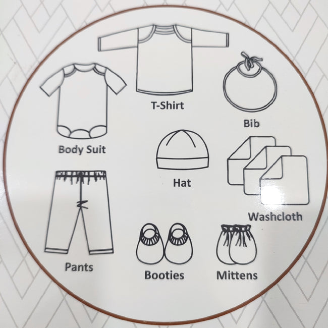 - Contains : Full Sleeves Bodysuit, Full Sleeves T-shirt, Trouser, Bib, Cap, Pair of Booties, Pair of Mittens & 3 Face Towels