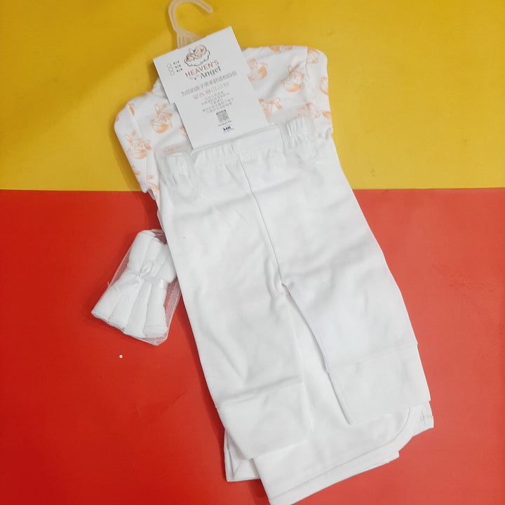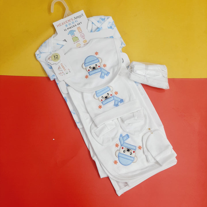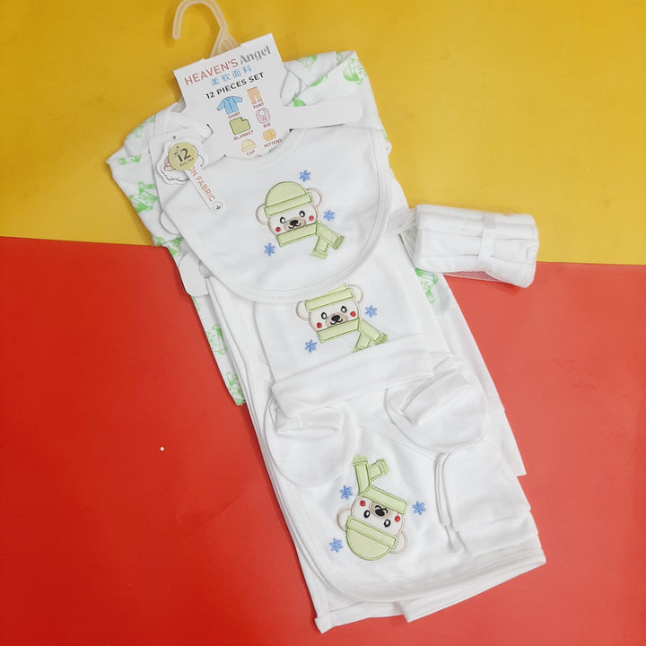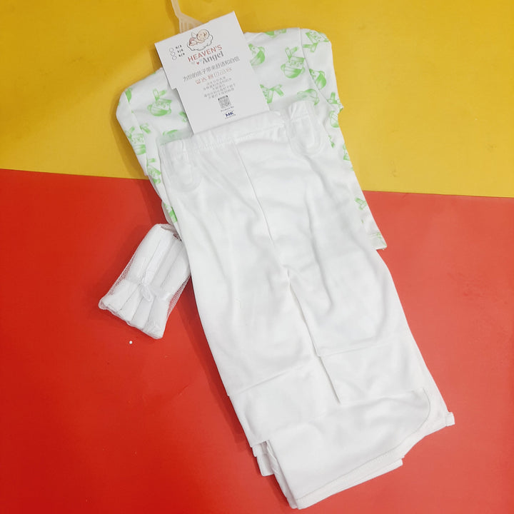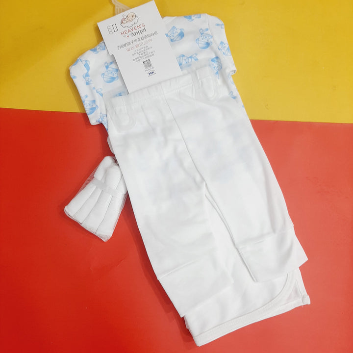 T Shirt. Pant. Mittens. Booties. Cat. Wrapping sheet. Hanger. 4 face towel, BibStuff: BlendedSize: 0 to 3 months