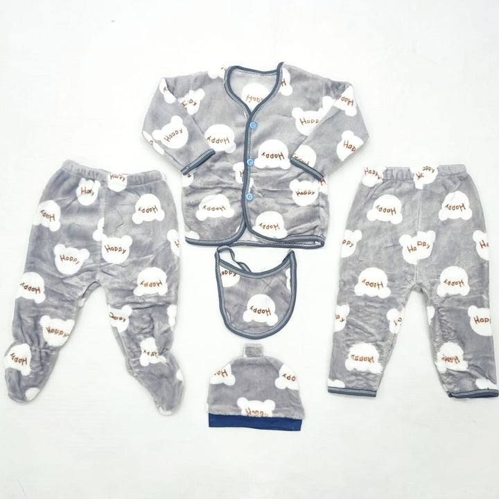 5 pieces Baby suit set for winter Size : 0 to 3 Months Shirt, two trousers, bib, cap stuff: Fleece