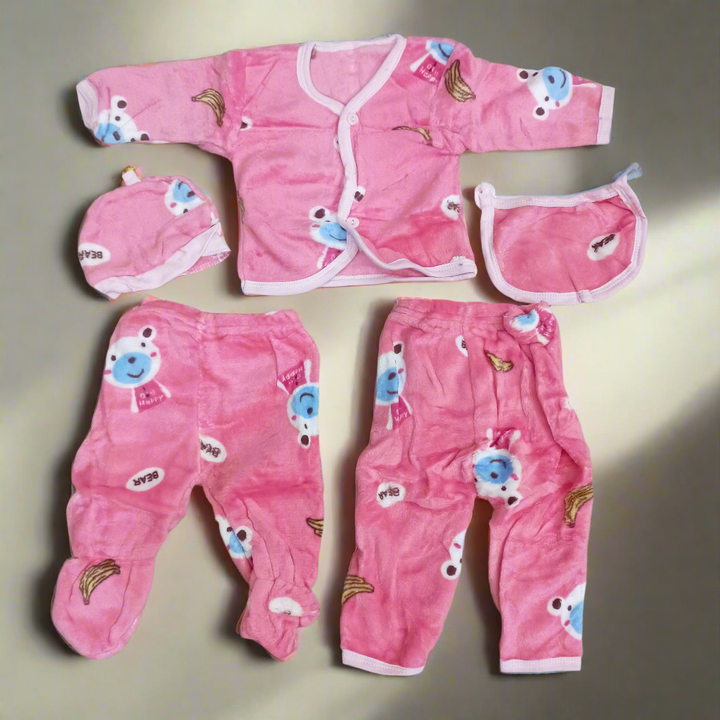 5 pieces Baby suit set for winter Size : 0 to 3 Months Shirt, two trousers, bib, cap stuff: Fleece