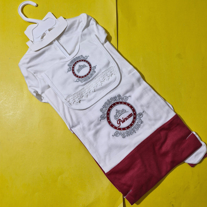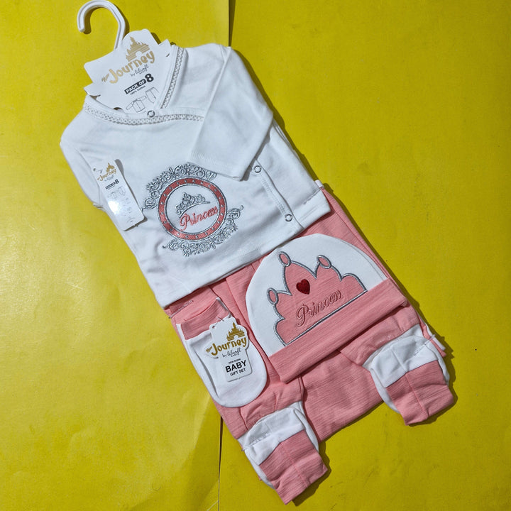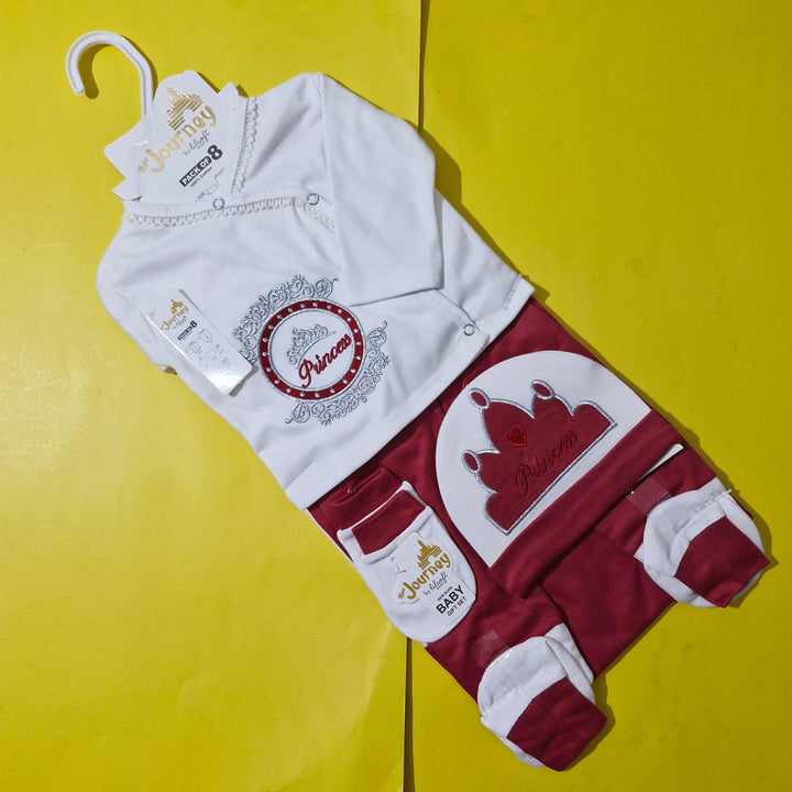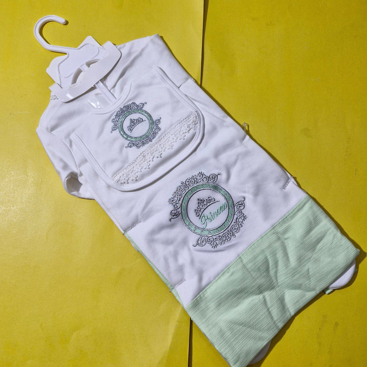 - Contains Full sleeves T-shirt , Trouser, Bib, Wrapping Sheet, Cap, Booties, mittens & Hanger