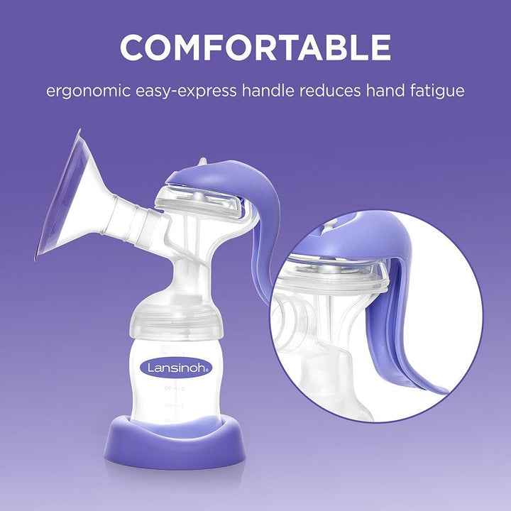 Our manual breastfeeding pump is comfortable, convenient and portable. The Lansinoh® Manual Breast Pump is ideal for occasional use at home or on the go. Switch easily between two pumping modes, Stimulation and Expression, to aid in let-down and maximize pumping efficiency. The hand breast pump's ergonomic easy-express handle reduces hand fatigue, and two sizes of ComfortFit® flanges, standard (25mm) and large (30.5mm), ensure ideal suction and pumping comfort.